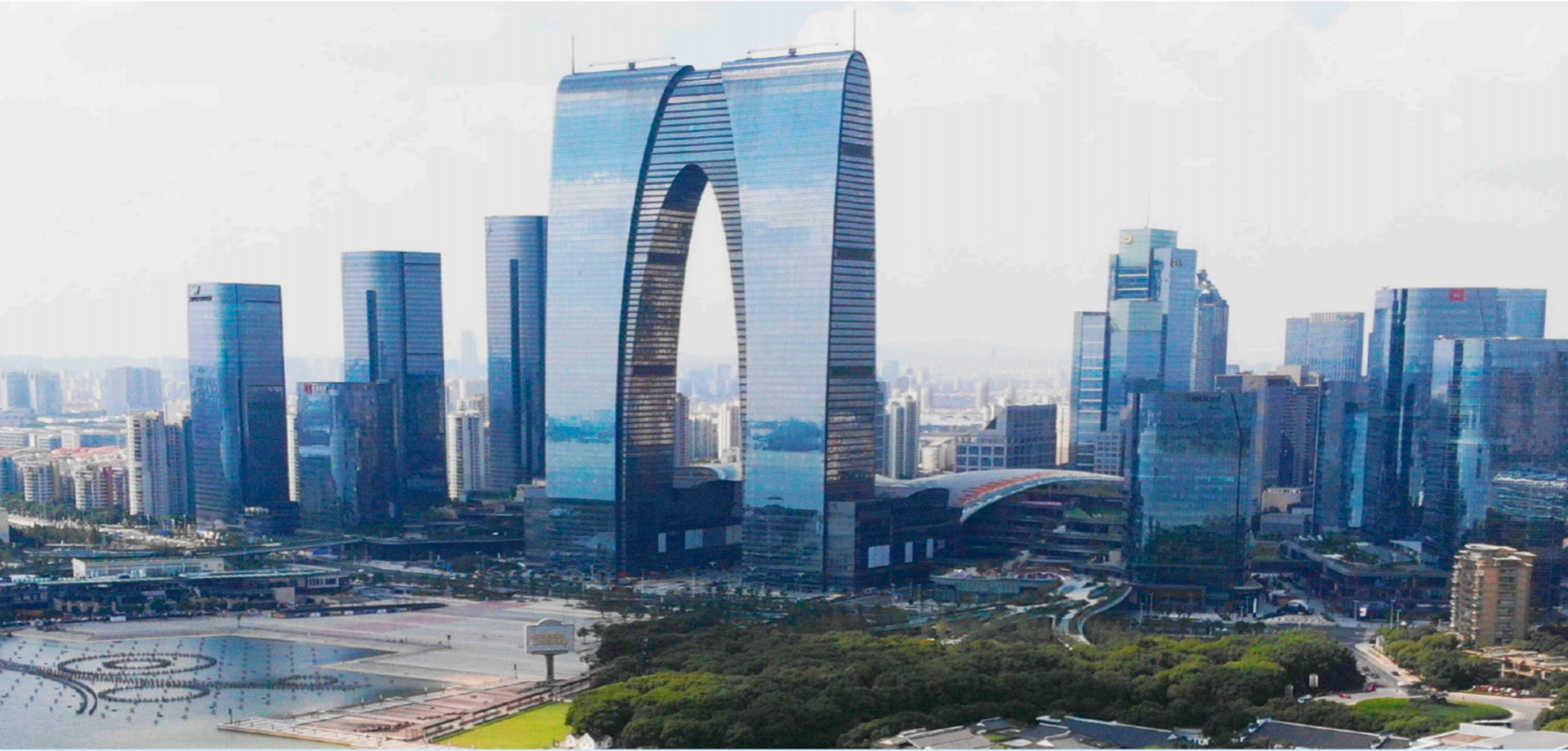 蘇州中心廣場項目位于蘇州工業園區金雞湖西側,毗鄰東方之門,居蘇州市域CBD核心位置,軌交1號線、6號線貫穿整個項目區域,整體占地21.1公頃,凈地面積13.9公頃,總建筑面積約182萬平方米,其中地上建筑面積130萬平方米、地下建筑面積52萬平方米。
