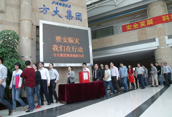 4月20日8時02分,四川省雅安市蘆山縣發生7.0級地震,人民生命財產遭受重大損失。一方有難,八方支援。在雅安人民在遭受災難的時候,方大集團在第一時間號召集團全體員工為災區捐款,支持雅安人民抗震救災。集團總部和分布在北京、上海、成都、沈陽、南昌、東莞等全國各地的方大集團員工紛紛捐款,以實際行動獻愛心。據不完全統計,截至4月23日,方大集團已經向雅安地震災區捐款已達257462元,以幫助災區人民重建家園,與災區人民一起共渡危難。這也是繼向汶川、玉樹地震災區捐款后,方大集團再一次向震區人民伸出援手,是方大集團“報國報民報一方”大愛精神的再次彰顯。