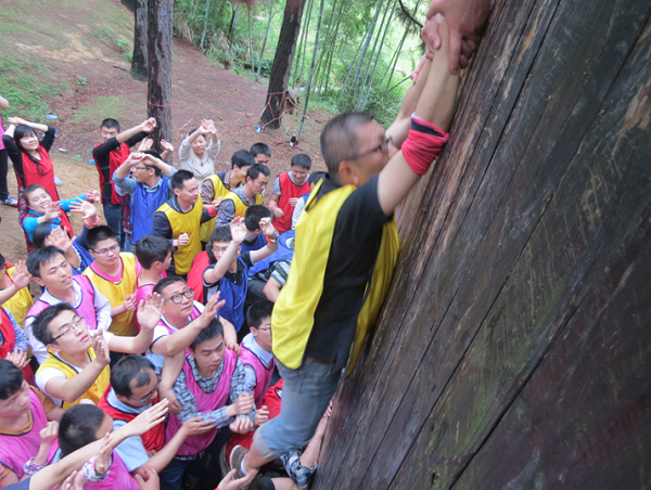 本次拓展訓練最感動人的項目莫過于最后的攀爬“畢業墻”,教官告訴大家:“沒有任何保險措施,什么道具都不能用,全隊學員必須在不違反規則的情況下,在規定的時間內全部翻越畢業墻才算成功,拓展訓練才算畢業。”怎么辦?只有團隊的力量才能翻越畢業墻,最后大家協商是第一排四個,一人手扶墻,一人抱緊對方的腰,其他人踩著他們的肩膀上去,先爬上去的人再用手拉下面的人上去,每一位隊員心中都暗暗鼓勵自己要勇敢,踩上隊員肩膀的時候,身后有幾十雙有力的手托住,一股力量在支持我們向上攀越,一種從未有的安全感油然而生,也充滿了勇氣。當所有人出色的翻越過畢業墻后,大家的眼睛已經濕潤了,最終的感動戰勝了辛苦。