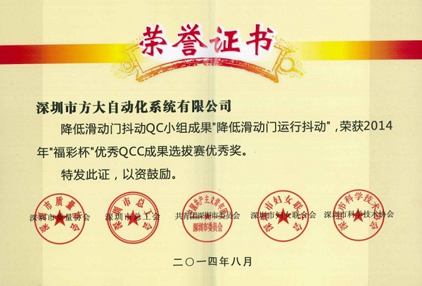 9月26日,方大建科公司獲得由深圳市質(zhì)量協(xié)會(huì)、深圳市總工會(huì)、共青團(tuán)深圳市委員會(huì)、深圳市婦女聯(lián)合會(huì)和深圳市科技技術(shù)協(xié)會(huì)聯(lián)合頒發(fā)的“2014年深圳市質(zhì)量管理小組活動(dòng)優(yōu)秀企業(yè)”稱號(hào)。同日,由深圳市質(zhì)量協(xié)會(huì)、深圳市總工會(huì)、共青團(tuán)深圳市委員會(huì)、深圳市婦女聯(lián)合會(huì)和深圳市科技技術(shù)協(xié)會(huì)聯(lián)合評(píng)定的“福彩杯”優(yōu)秀QCC成果優(yōu)秀獎(jiǎng)揭曉。方大建科公司打膠質(zhì)量控制QC小組成果“提高單元板塊封邊合格率”榮獲2014年“福彩杯”QCC成果選拔賽銀獎(jiǎng),方大建科公司單元板塊安裝質(zhì)量控制QC小組成果“提高單元板塊安裝水平度合格率”,方大建科公司石材幕墻安裝質(zhì)量控制QC小組成果“確保石材面板安裝接縫合格率”、 方大自動(dòng)化公司門機(jī)梁皮帶夾改造QC小組成果“提高門機(jī)梁傳動(dòng)系統(tǒng)組裝合格率及使用壽命率”榮獲“深圳市2014年‘福彩杯’QCC成果選拔賽優(yōu)秀獎(jiǎng)”, 集團(tuán)公司企業(yè)管理部尚清榮獲“深圳市質(zhì)量管理小組活動(dòng)卓越領(lǐng)導(dǎo)者”稱號(hào),方大建科公司張錦德榮獲“深圳市質(zhì)量管理小組活動(dòng)優(yōu)秀推進(jìn)者” 稱號(hào)。