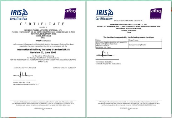 深圳市方大自動化系統(tǒng)有限公司作為全球最大的軌道交通屏蔽門系統(tǒng)供應(yīng)商,導(dǎo)入IRIS經(jīng)營管理體系是公司與世界先進管理方法接軌的必要舉措。IRIS管理體系認證證書的獲得,是獨立的第三方機構(gòu)對方大自動化公司的管理體系符合國際鐵路行業(yè)統(tǒng)一規(guī)范標準的認可。通過IRIS經(jīng)營管理體系認證,意味著方大自動化公司的管理體系接軌世界先進管理方法,在ISO9000基礎(chǔ)上進一步提升企業(yè)的整體管理水平。在取得IRIS管理體系認證證書后,方大自動化公司的相關(guān)認證信息將由IRIS管理中心錄入IRIS門戶網(wǎng)站認證信息庫進行統(tǒng)一管理,同時可供全球鐵路行業(yè)客戶進行檢索、瀏覽,這為方大自動化公司拓展市場領(lǐng)域、獲取更多的國際訂單提供了強有力的保障。