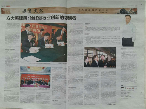 2016年12月7日,《深圳晚報》深商史記欄目以兩個整版超大篇幅報道方大集團股份有限公司董事長熊建明的風雨創(chuàng)業(yè)歷程,講述了熊建明董事長20多年來在建筑新材料、節(jié)能環(huán)保等行業(yè)領域的奮斗故事,記錄了他把方大集團從3萬元起家、市場為零的小公司,培育成領先國內(nèi)同行、坐擁多項技術成就獎的領袖級企業(yè)的傳奇經(jīng)歷,淋漓盡致地展現(xiàn)了熊建明董事長“敢為天下先”的奮斗姿態(tài)和樸實的創(chuàng)業(yè)情懷。