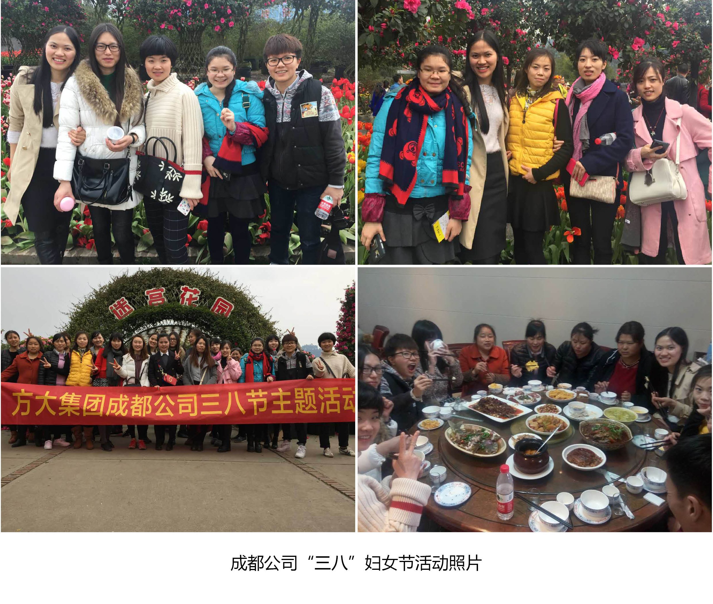在成都,成都公司組織全體女員工前往位于成都市南郊的“花舞人間”國家4A級(jí)景區(qū)進(jìn)行半日游活動(dòng)。期間,大家進(jìn)行了賞花、趣味小游戲和聚餐等。此次活動(dòng)有效的增進(jìn)了方大成都公司女員工彼此間的情誼,豐富了公司的企業(yè)文化。