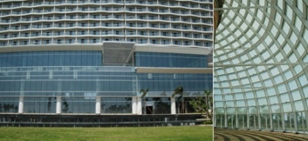 該項目由國際會議中心(包括大會議廳、中小會議廳、休息大廳、貴賓休息廳、主宴會廳及附屬設施)、音樂廳及酒店組成。國際會議中心地上6層,最大建筑標高為41米;五星級酒店地上18層,最大建筑標高為81.3米;幕墻面積達90200平方米。該項目幕墻系統由肋點式玻璃幕墻、橫明豎隱玻璃幕墻、豎明橫隱玻璃幕墻、石材幕墻、鋁合金推拉門、鋁板吊頂及挑檐、采光頂、金屬屋面、鋁合金格柵、鋁合金百葉、玻璃欄板及玻璃雨蓬等組成,幕墻造型復雜多樣。方大團隊在生產制造環節采用多種新工藝,確保幕墻材料質量過硬且供應高效。