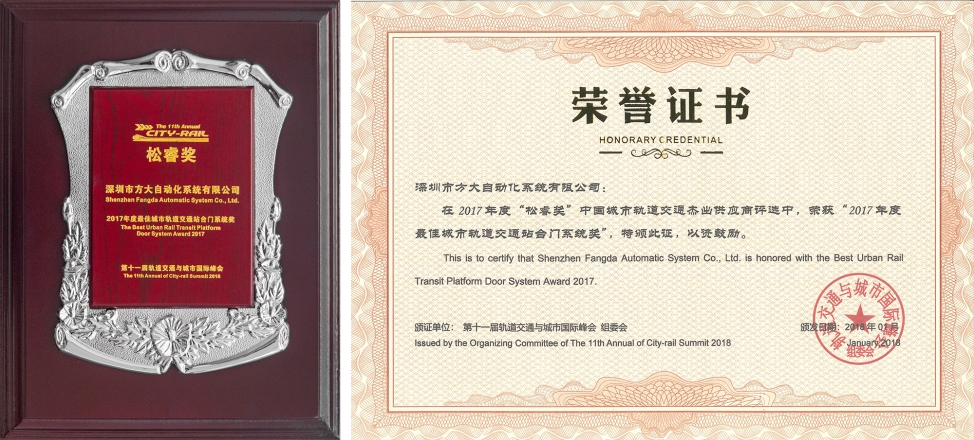 自動化公司作為全球規模宏大的軌道交通站臺門系統供應商,獨立研發具有完全自主知識產權的站臺門系統,已廣泛應用于全球32個城市的城市軌道交通中,每天有超過2000萬人次使用方大站臺門系統,在市場占有率、技術、品牌等方面居行業龍頭地位。此次獲頒“2017年度最佳城市軌道交通站臺門系統獎”,反映了軌道交通行業對自動化公司科創技術水平和發展能力的認可。