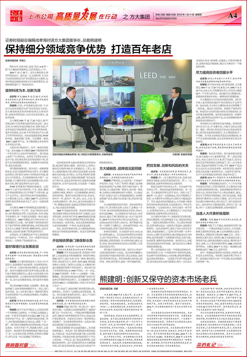 熊建明:首先,非常感謝證券時報“上市公司高質量發展在行動”采訪團來公司采訪。方大集團的成長和深圳的發展是大體同步的,感謝深圳的包容,讓公司在這里誕生、成長和發展。