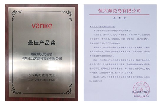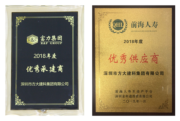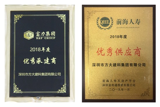富力集團授予方大建科“2018年度優秀承建商”、前海人壽授予方大建科“2018年度優秀供應商”、 萬科授予方大建科“最佳產品獎”、恒大海花島給方大建科一封感謝信。年末獲得的各大地產商授予的榮譽,涵蓋產品質量、工程交期、客戶服務等多個方面,是業主對方大建科在2018年經營管理及公司綜合實力的充分認可。