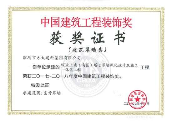 中國建筑工程裝飾獎是由中國建筑裝飾協會主辦的評選活動,自2001年起每年進行評選,是建設部批準設立的中國建筑裝飾行業的最高榮譽獎。方大建科承建的四項幕墻工程獲此獎項,是對公司精湛的幕墻設計能力和先進的施工工藝的充分肯定。