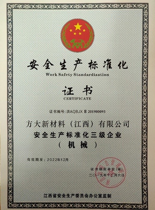 近日,經江西省南昌市應急管理局綜合評審,方大集團全資子公司方大新材料(江西)有限公司順利通過安全生產標準化三級企業審核,被授予“安全生產標準化三級企業”稱號。