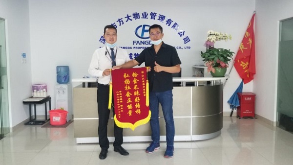 深夜,城市安靜了下來。為消除安全隱患,方大物業(yè)例行對地下室停車場進行巡邏,檢查車輛停放情況。這天凌晨1點30分,停車場巡邏員李章龍在地下室撿到了一個手提包,內有兩部手機一副眼鏡(蘋果、三星各一部,價值萬元),想到失主找不到物品,肯定特別著急,他馬上將手提包交至監(jiān)控中心并積極尋找失主,終于在當日下午將物品交還至失主。以為無法找回的手提包完璧歸趙,失主向方大物業(yè)贈送一面錦旗“拾金不昧好榜樣、弘揚社會正能量”,表達感謝之情。
